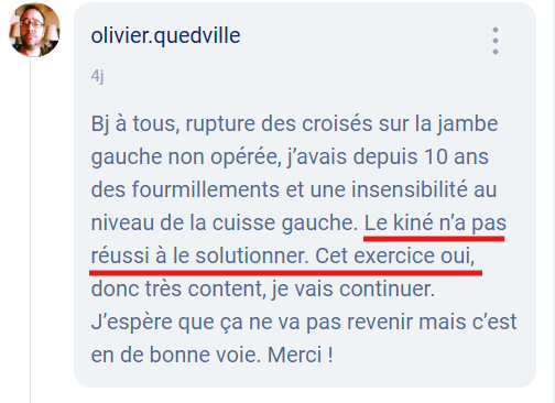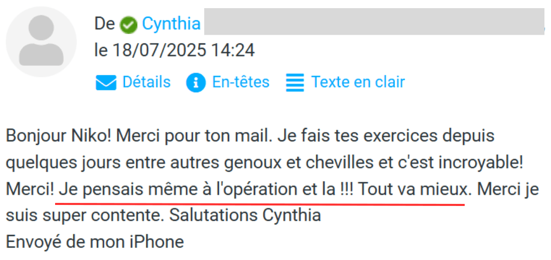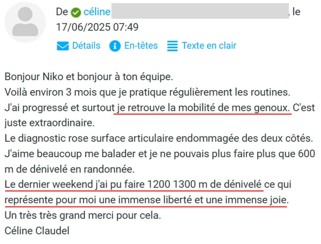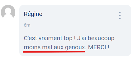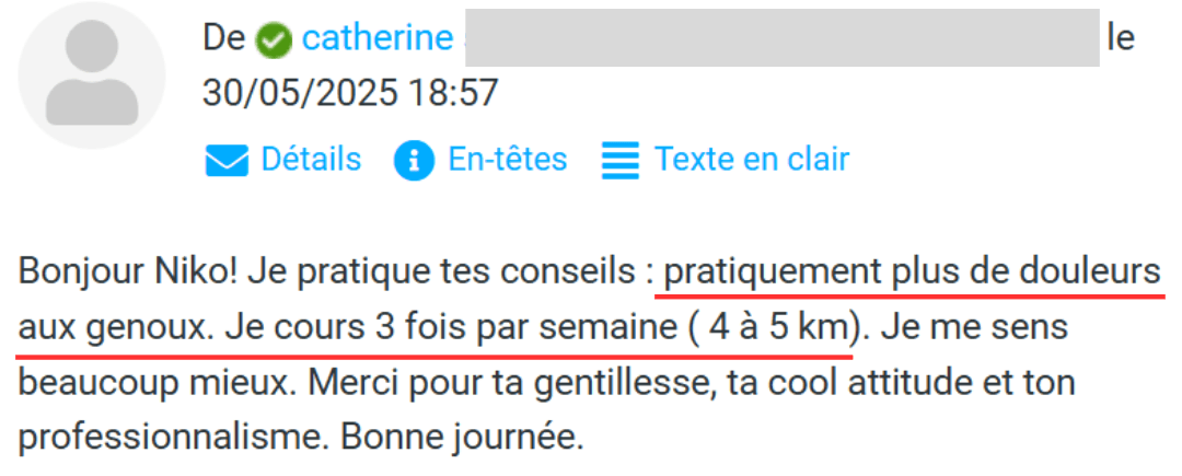 "Pratiquement plus de douleurs aux genoux. Je cours 3 fois par semaine (4 à 5 km). Merci !"